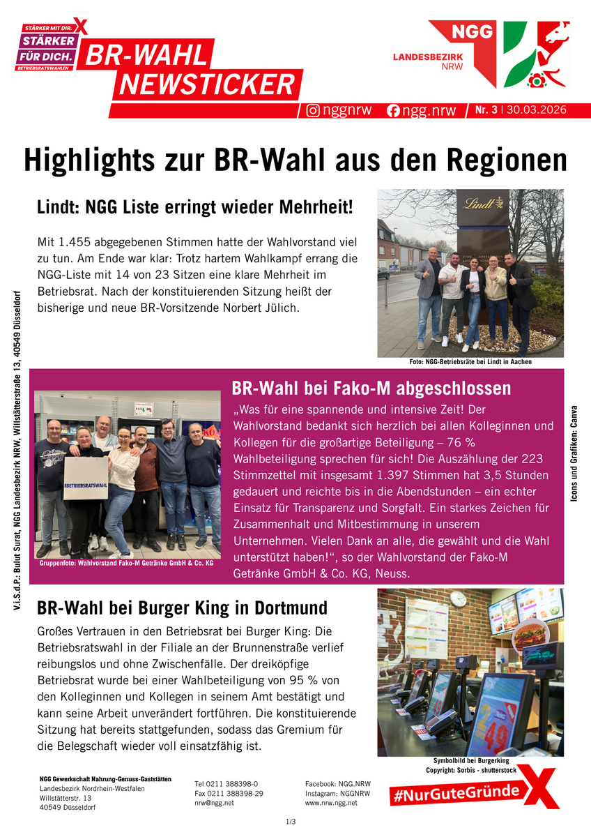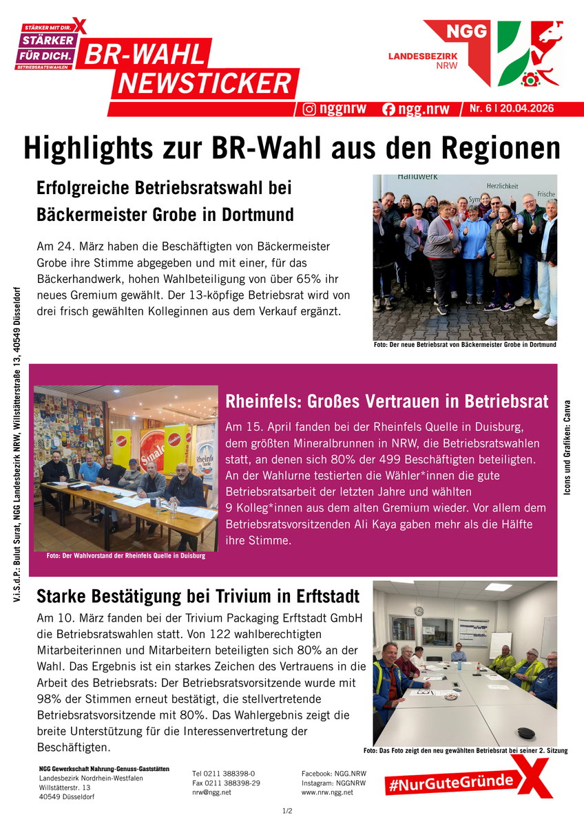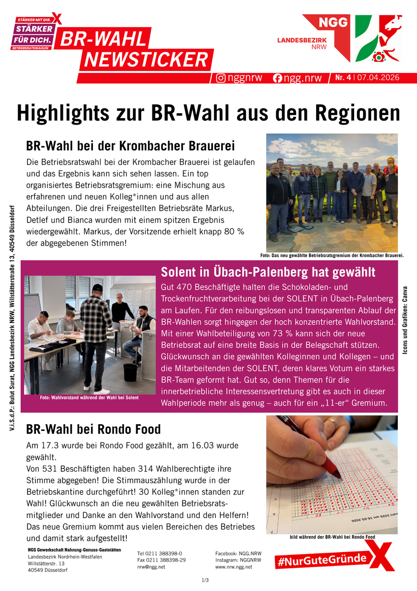 Betriebsräte sind gelebte Demokratie und Mitbestimmung im Betrieb. Alle vier Jahre können die Beschäftigten ihre Interessenvertretung wählen. Zwischen März und Mai 2026 ist es wieder so weit: In der Ernährungsindustrie, im Gastgewerbe und im Bäckerhandwerk werden in NRW hunderte Betriebsratsgremien gewählt. Viele Belegschaften nutzen die Gelegenheit und wählen zum ersten Mal ihren Betriebsrat. Wir halten euch auf dieser Sonderseite über alle Termine und News auf dem Laufenden.