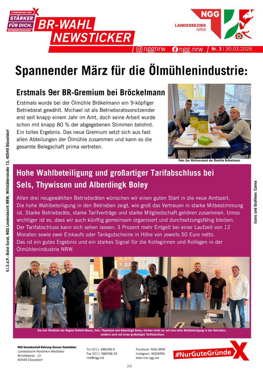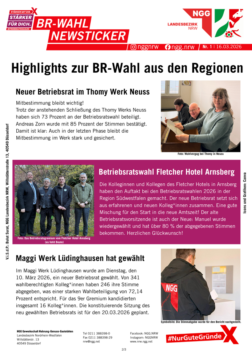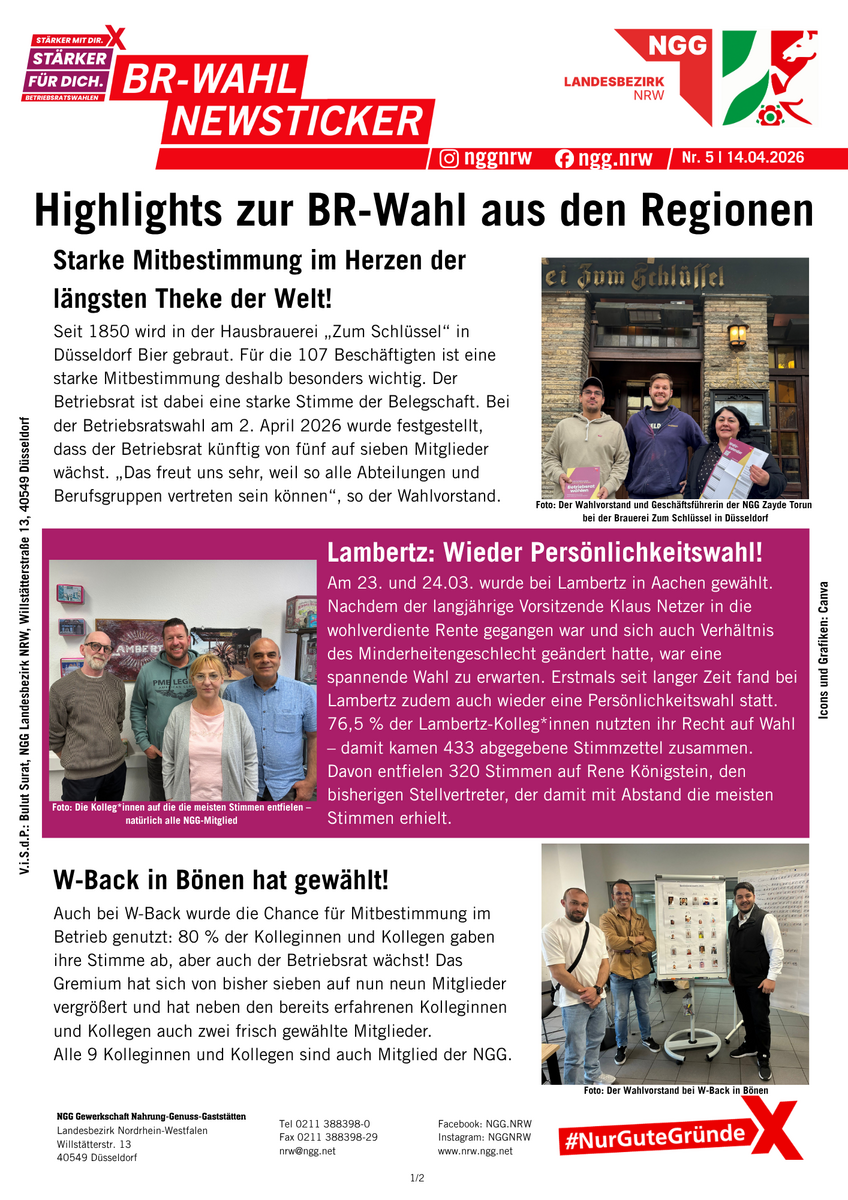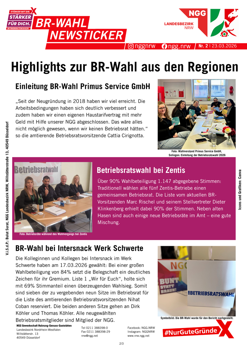 Betriebsräte sind gelebte Demokratie und Mitbestimmung im Betrieb. Alle vier Jahre können die Beschäftigten ihre Interessenvertretung wählen. Zwischen März und Mai 2026 ist es wieder so weit: In der Ernährungsindustrie, im Gastgewerbe und im Bäckerhandwerk werden in NRW hunderte Betriebsratsgremien gewählt. Viele Belegschaften nutzen die Gelegenheit und wählen zum ersten Mal ihren Betriebsrat. Wir halten euch auf dieser Sonderseite über alle Termine und News auf dem Laufenden.