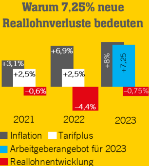 Die Arbeitnehmer*innen haben bereits 2021 und 2022 massiv an Reallohn verloren. Die Beschäftigten können es sich schlichtweg nicht leisten, unterhalb der Inflation abzuschließen.